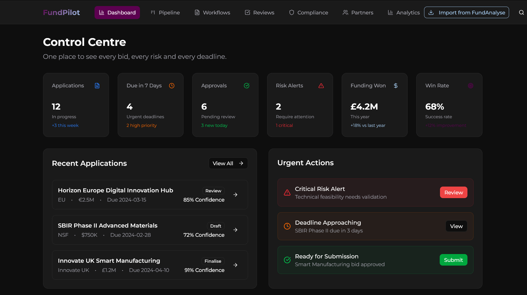 Stop drowning in calls and tenders. FundAnalyse scans thousands of sources daily and scores strategic fit, value and complexity so you only see the opportunities that match your strategy. Each result includes a decision brief and a full analysis mapped to your priorities.