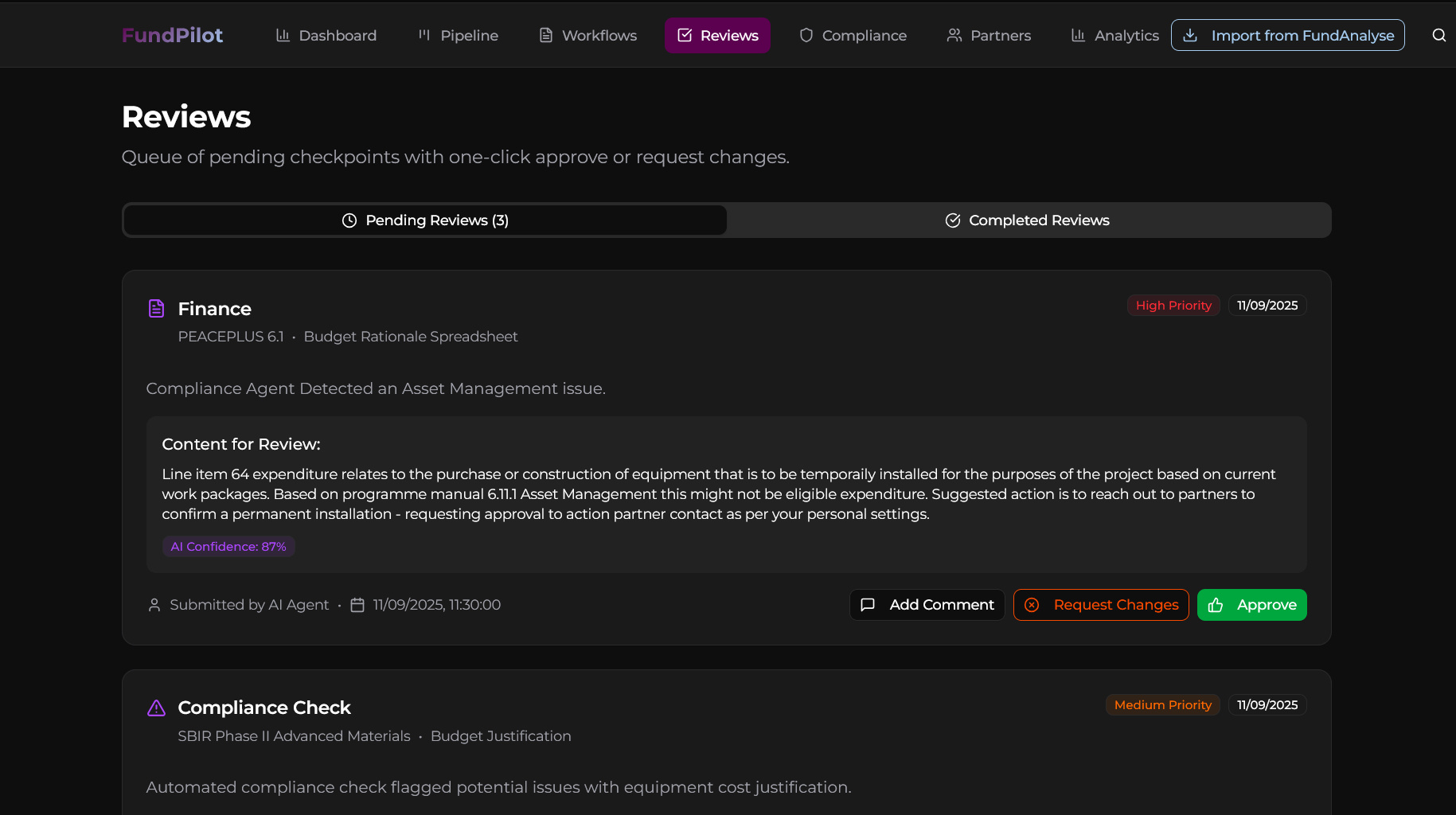 FundPilot’s Agents continuously scan your documents, contracts, and financials against programme manuals and eligibility rules, then present a queue of flagged items for human approval.