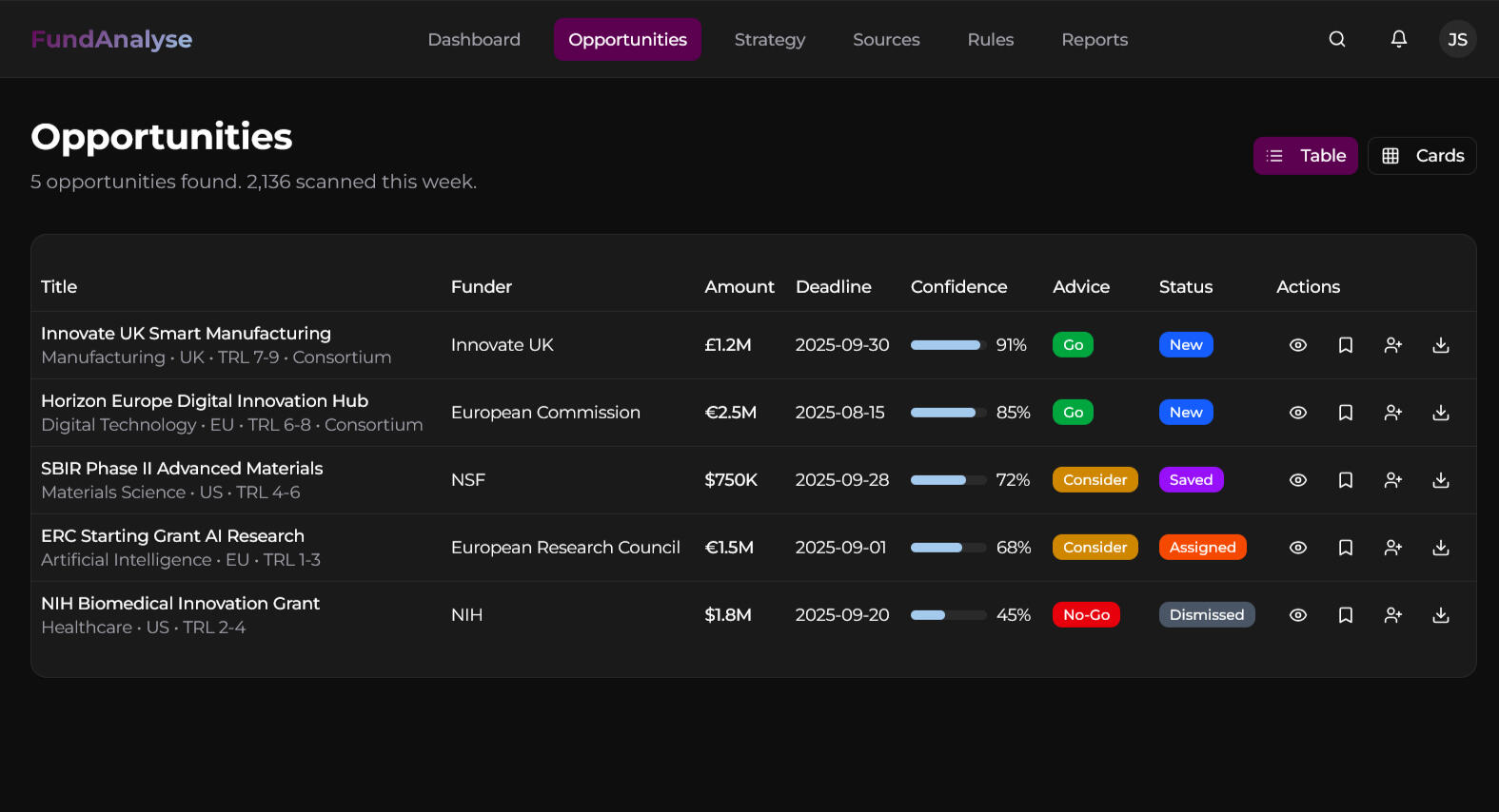 Stop drowning in calls and tenders. FundAnalyse scans thousands of sources daily and scores strategic fit, value and complexity so you only see the opportunities that match your strategy. Each result includes a decision brief and a full analysis mapped to your priorities.
