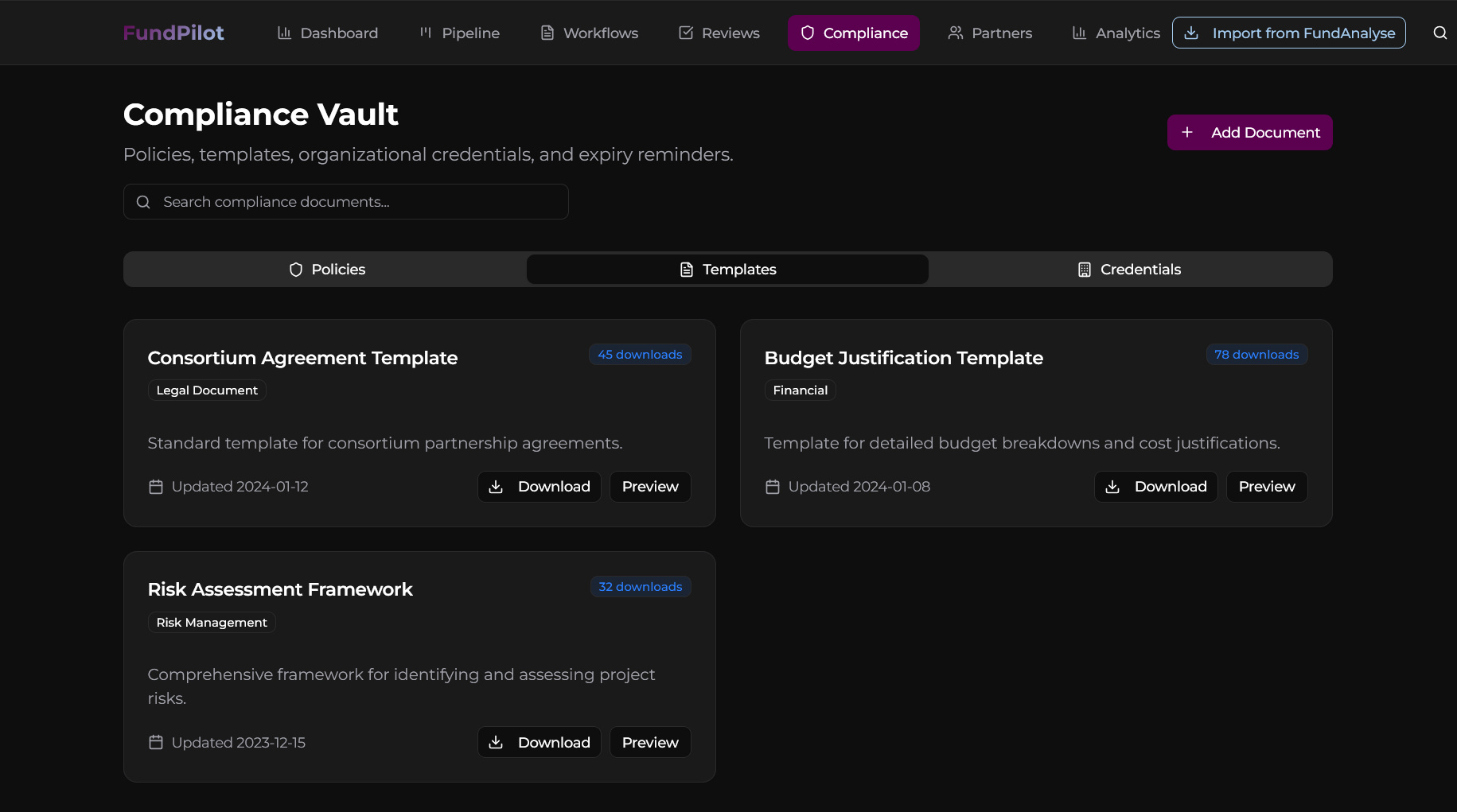 The Compliance Vault is where FundPilot’s Agents learn your organisation’s rules. By storing templates, policies, and credentials here, you ensure that every AI-generated output aligns with your standards.